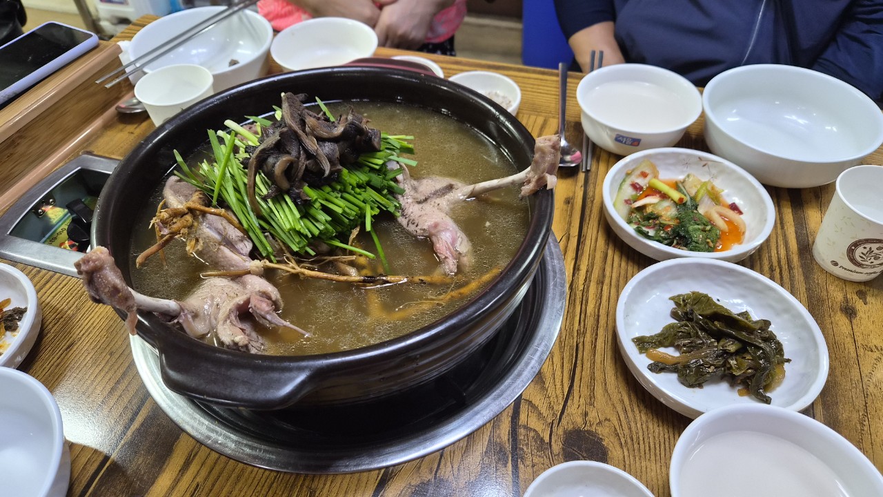 지인이 미리 예약해둔 식당에서 능이 오리백숙 과 막걸리로 회포를 풀며