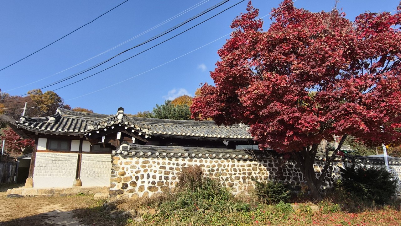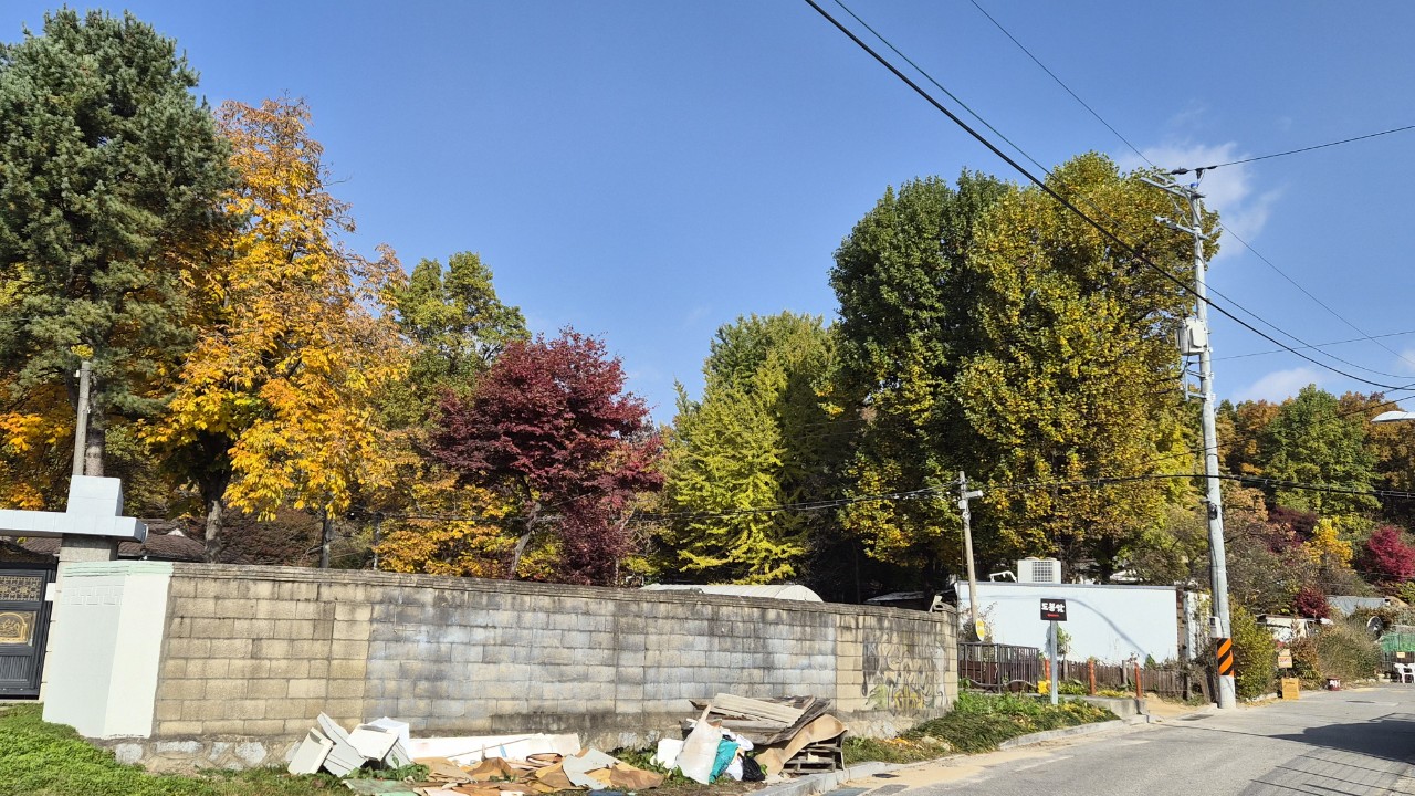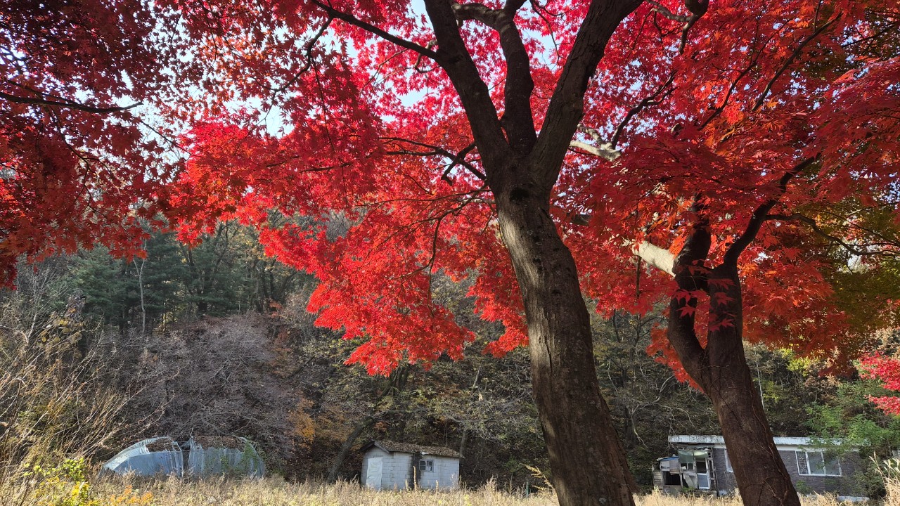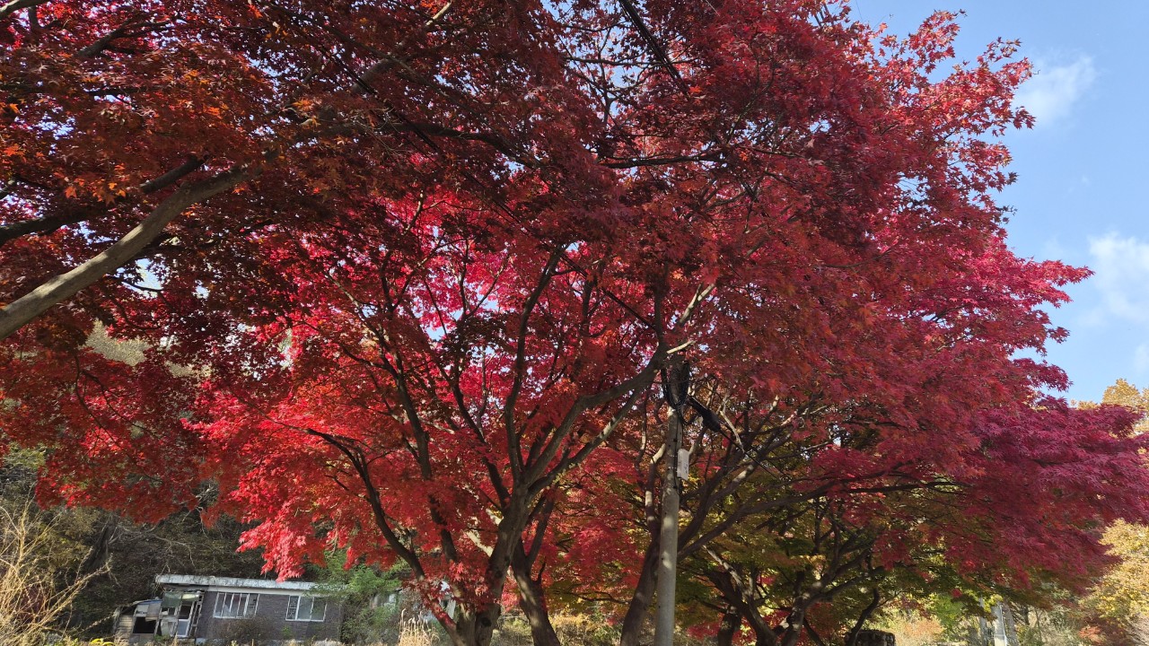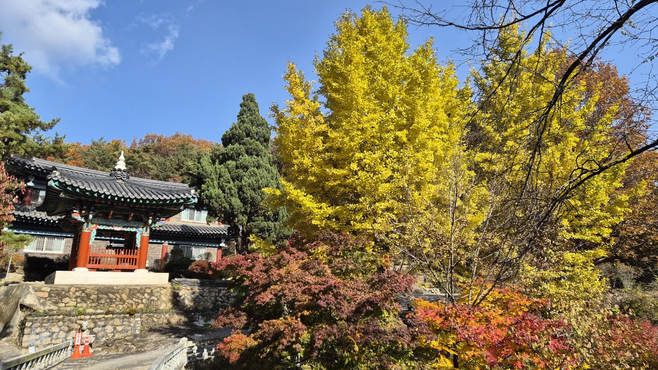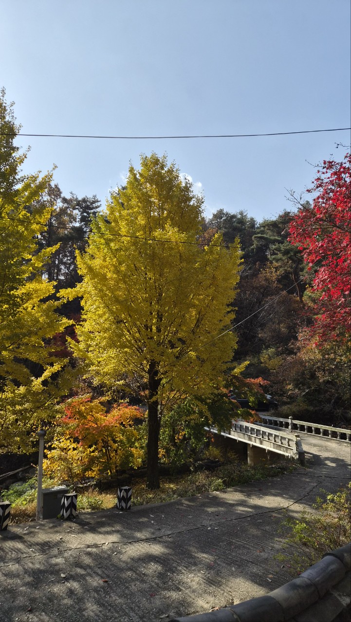 노란색으로 물든 은행나무 붉게 물든 단풍나무 와