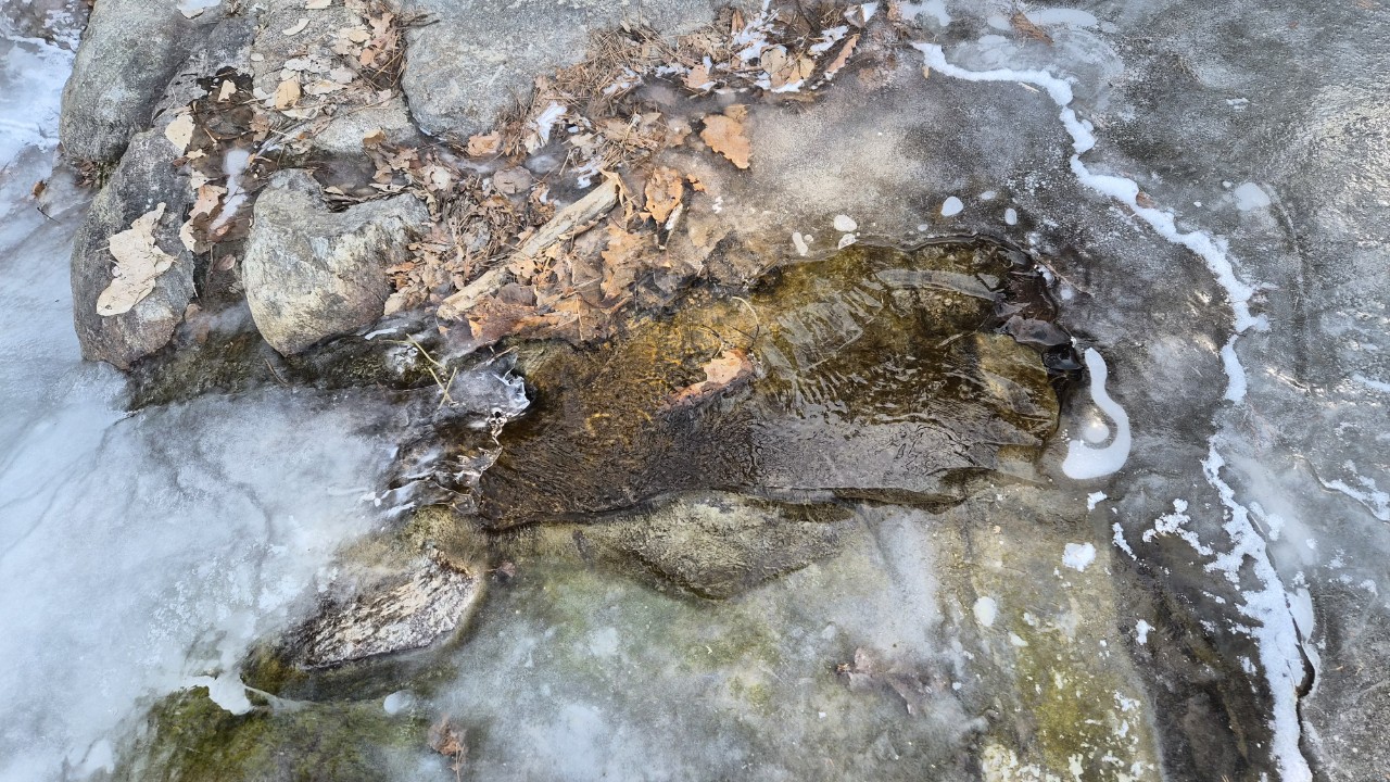 한파로 개울 물이 얼었지만 얼음장 밑에서는